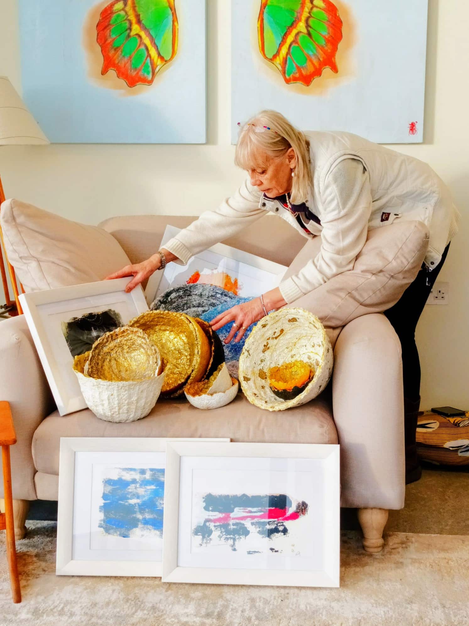 Lindy is a painter/sculptor specialising in mixed-media, acrylics and Indian inks. She’s inspired by textiles, fashion and colour. Her unique bowls are sculpted from upcycled paper and are decorated with gold and silver leaf.